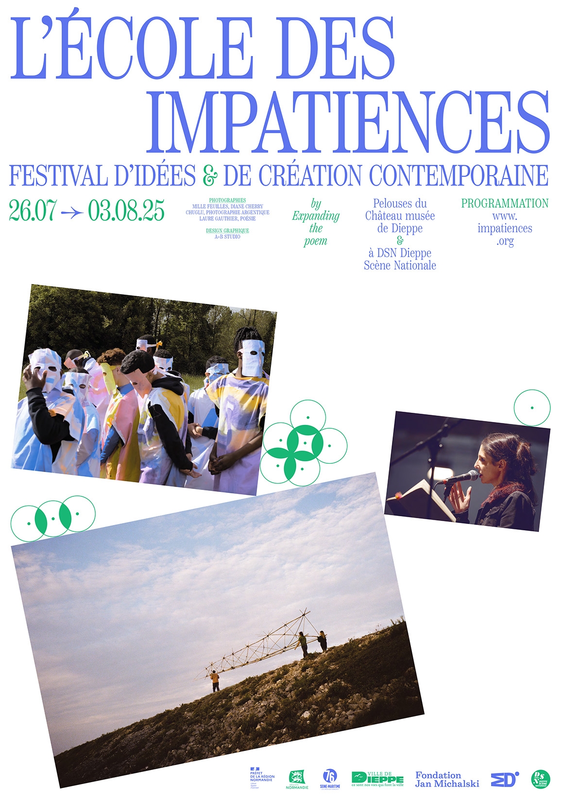 L’École des Impatiences est une biennale pluridisciplinaire qui fait la part belle aux débats d’idées, à la pensée contemporaine, aux arts visuels, à la littérature, à la poésie. Elle est une école sans mur ouverte à tous·tes, basée à Dieppe en Normandie. À partir de différents formats de rencontres (conférences, ateliers, performances), l’enjeu est d’élaborer collectivement le monde qui vient, depuis nos impatiences sociales, écologiques, politiques, accompagné de la pensée des artistes, des chercheur·euses et des écrivain·es.