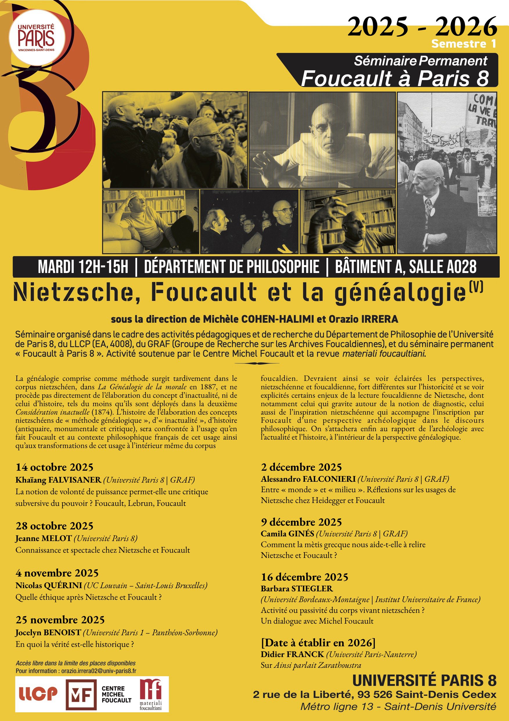 Séminaire permanent Foucault à Paris 8. Nietzsche, Foucault et la généalogie (V). 1er semestre 2025-2026